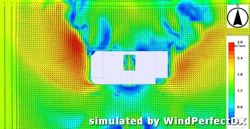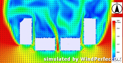入流風由南方迎風面吹拂,並於東側及西側兩棟建築物外側轉角的產生角隅風現象,風場加速,風勢增強。