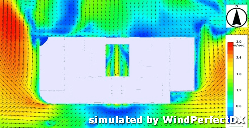 於中央穿廊入口面積大,地面風場能順勢從中央穿廊由南往北吹,並受入口之縮流現象影響,此處風場加速,需注意穿廊之強風。