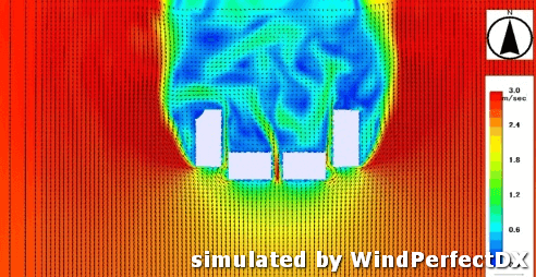主導風向為南風,北側背風側區域較近處則直接受到本案建物阻擋風場而風場微弱。建築北側較遠處產生渦流效應部份北側風場受壓力差影響而回吹至此處補充部份風場。