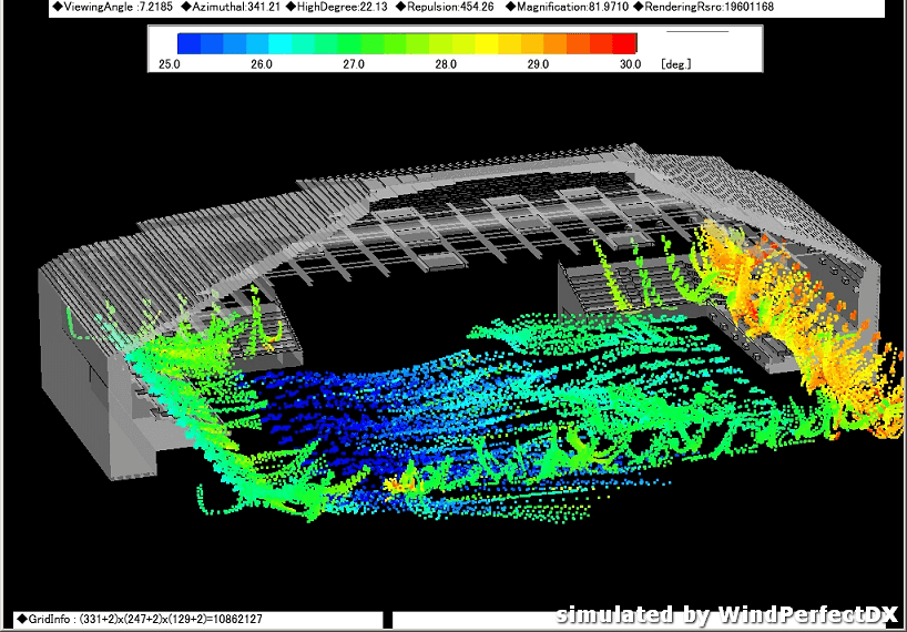 模擬結果得知競技場冷氣空調風量雖十分足夠,但觀眾席的冷氣空調風量卻是不足的,需擬定增強觀眾席風量的方案。