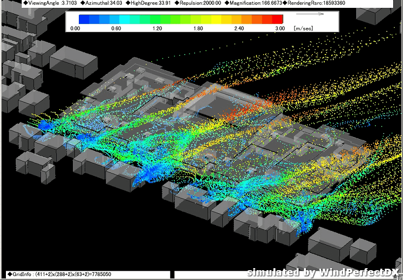 為了將室外的風有效的導入建物室內,進行了集風裝置有效的配置和方向評估。同時也全面性評估建築物內的內牆•隔板設計。