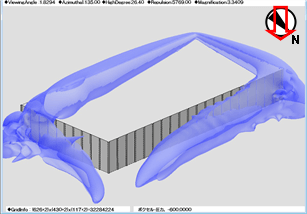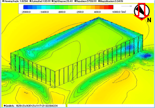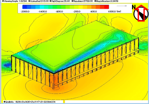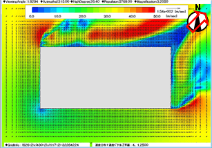 如案例,運用WindPerfectDX檢討倉庫對風壓的負荷能力,並掌握建築物全體承受風壓的分佈狀態。另外,可以也可以改變流入風的風向、風速並同時考量周邊建物及地形起伏對主體建築物的影響。