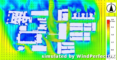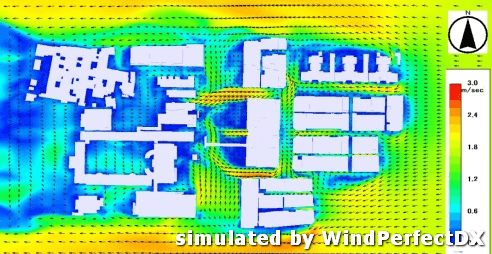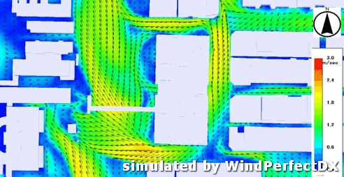 室外風場環境適用於解析物件建築物與周邊建築物的關係,以及建築與周邊環境之間的關係。藉由模擬基地建物設計對於周邊環境的風場環境影響,給予設計師修正初期方案的建議,將可實現提升建築設計品質。