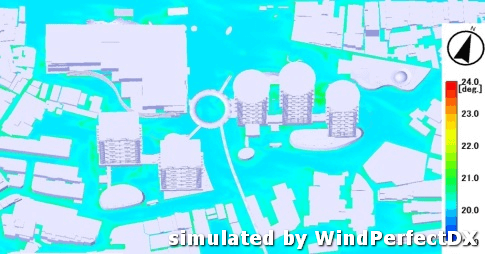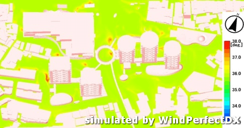 由一樓人行高度(1.5公尺高)觀察溫度場,空氣溫度熱量來源主要為太陽幅射,太陽幅射部份經由地面及建物吸收,使地面溫度及建物表面溫度上升後再藉由幅射、對流及傳導將熱能傳至空氣之中。此外,風場環境將會影響散熱,風速越高,散熱效果越好,人體舒適度越高,但若為滯留風場則溫度將久散不去而升高。